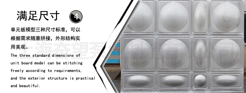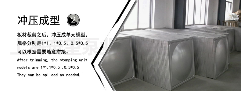 由單元矩型模壓板,優(yōu)化組合,任意拼裝,利用最少的耗材,通過材料變型的方法達(dá)到最佳強(qiáng)度的效果,水箱成型后的線型流暢,立體感好,且能美化市容。